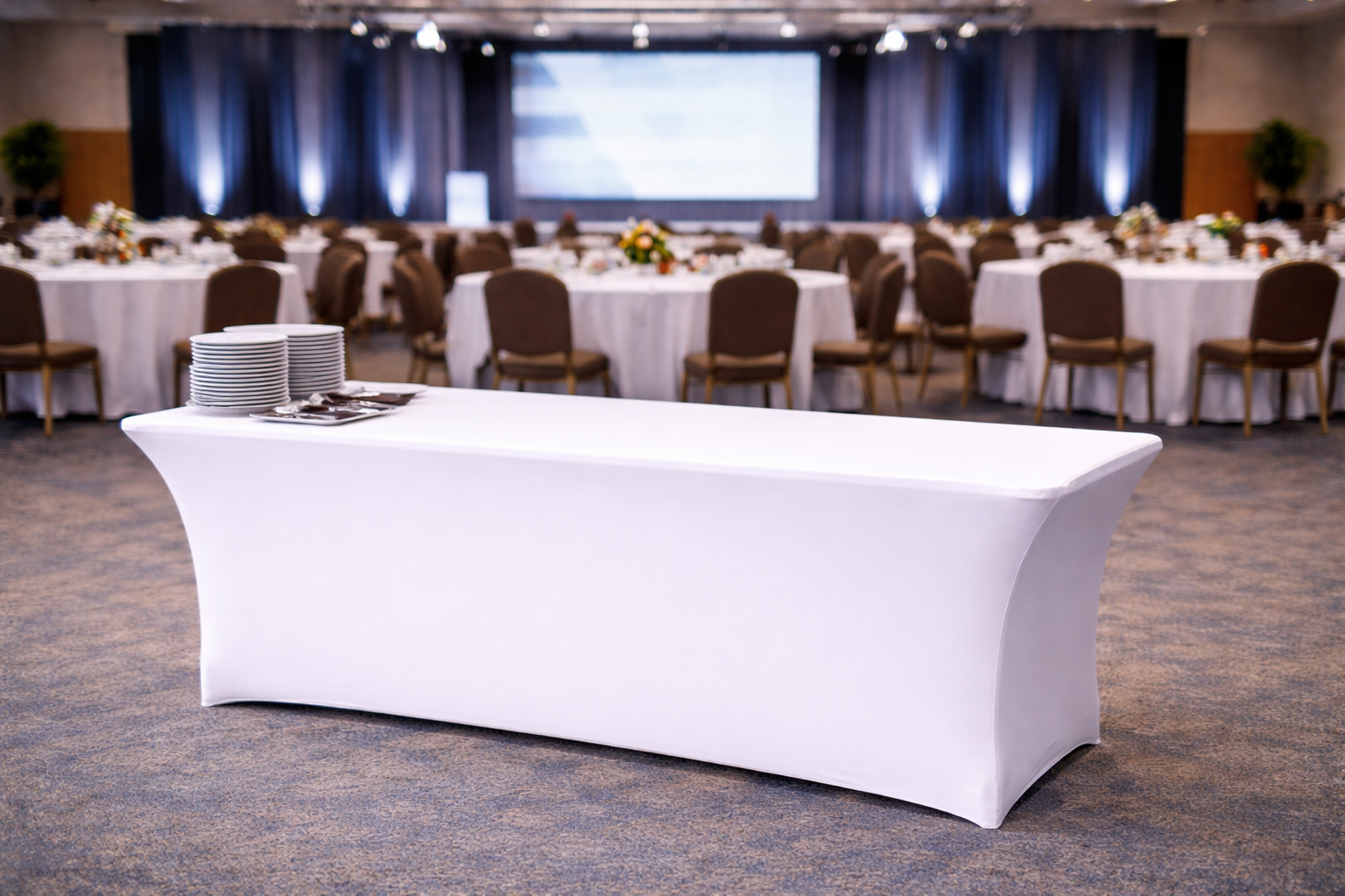 Husă albă pentru masă de bufet, care oferă un aspect elegant și festiv, perfectă pentru orice eveniment special.