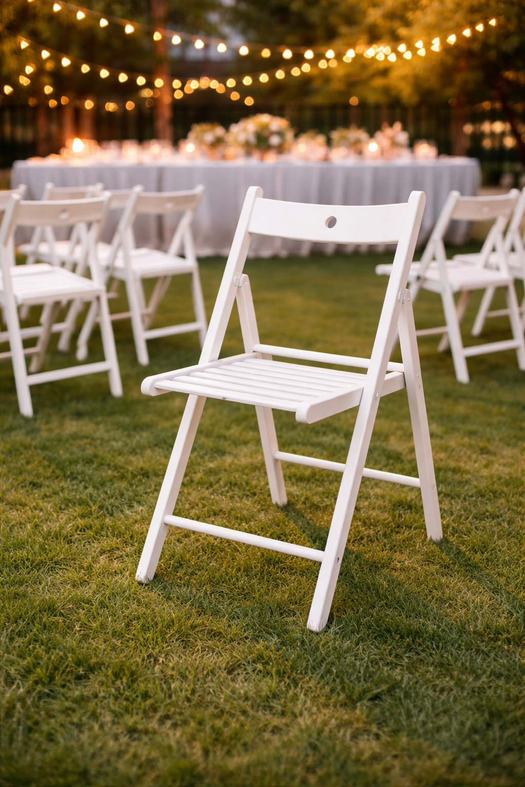 Scaunul pliant, confecționat din lemn vopsit alb, este practic, ușor de transportat și versatil, ideal pentru spectacole, prezentări, festivaluri, târguri, expoziții, nunți cu tematică rustică sau ceremoniile de cununie.