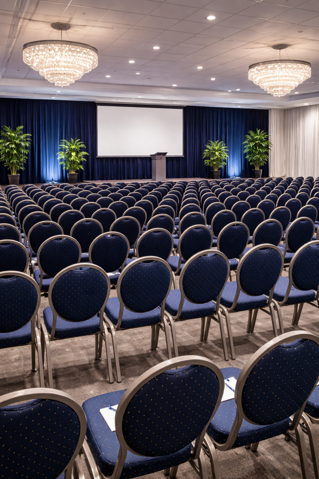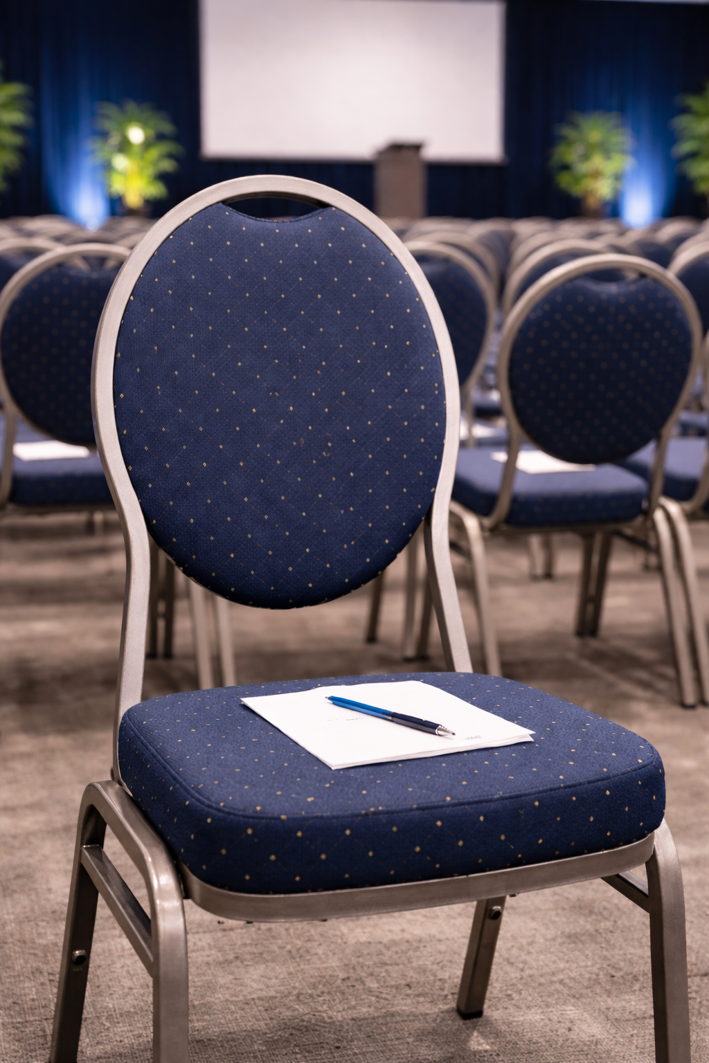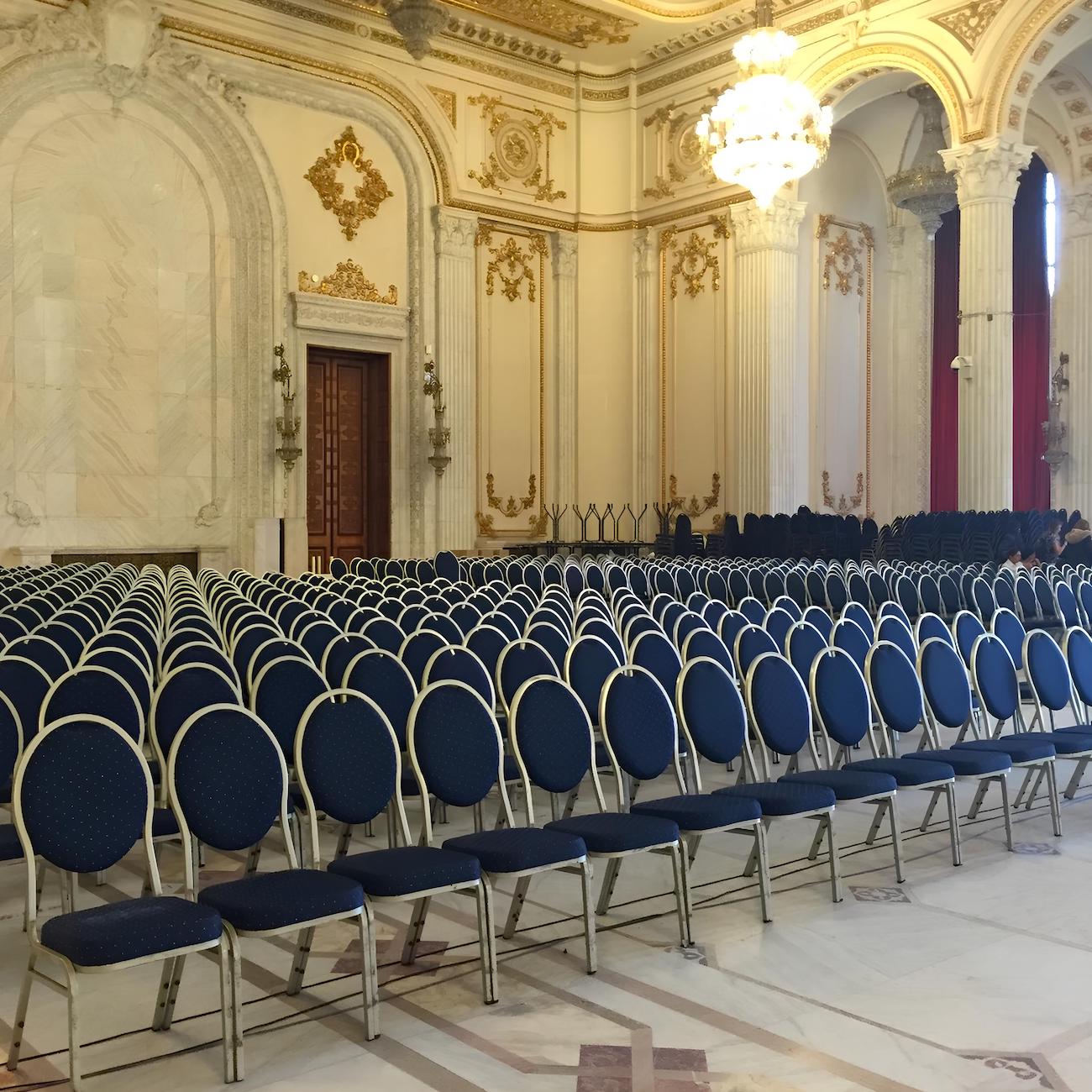 Scaunele tapitate sunt solide și confortabile, ideale pentru conferințe, congrese, spectacole, concerte sau alte evenimente cu mulți participanți, oferind durabilitate și confort, cu dimensiuni 44x58x94 cm și greutate 6 kg.